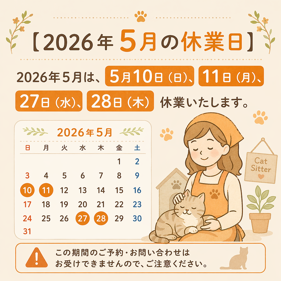 【2026年5月】休業日のお知らせ|西谷「ねこのお世話屋」